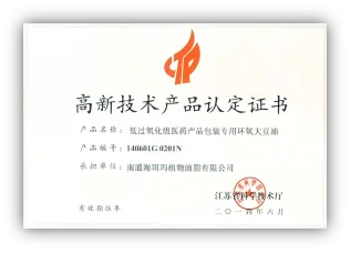 Core patents like "Continuous Production Method of Epoxidized Soybean Oil" have driven technological innovation in the industry. Co-building R&D platforms with universities including Guangzhou Medical University and Jiangnan University, it has participated in formulating the industry standard Plasticizer - Epoxidized Soybean Oil, led the development of the group standard Bio-based Plasticizers for PVC Soft Products, and obtained titles and authoritative certifications such as "National Torch Program Industrialization Demonstration Project" and "High-Tech Enterprise".