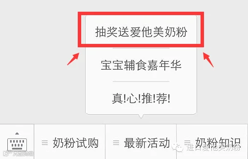 第一步:进入公众账号,点击底部菜单“最新活动→抽奖送爱他美”.