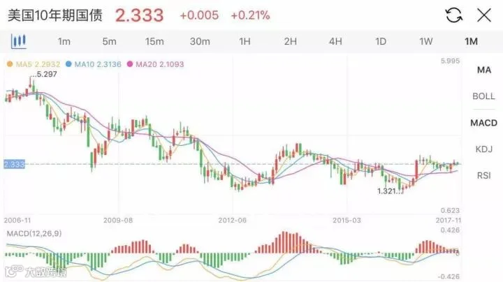美国十年期国债收益率从5.3%降至最低1.3%