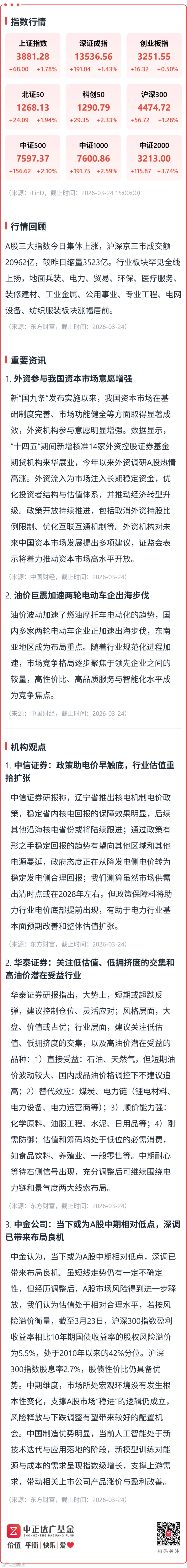 【收盘点评】外资参与我国资本市场意愿增强;油价巨震加速两轮电动车企出海步伐 中正达广基金
