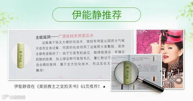 美容教主伊能静总结来的护肤秘籍,在她的新书61页中写道:这款属于俗又大碗的化妆水,曾经有明星出国因为气候不适而全身过敏,同团的化妆师用了这瓶帮大家敷脸,居然全部奇迹般好了!由于它是有机丝瓜,做得很清凉,有镇定肌肤的效果,加上绿豆粉可收敛毛孔,薏仁粉还可美白,也适合晒后使用,属于全方位的化妆水。夏天必备哦。它只有 天然丝瓜水这个成分,没有任何添加化学成份的添加剂。所以孕妇、哺乳期,甚至男士都可以使用哦。