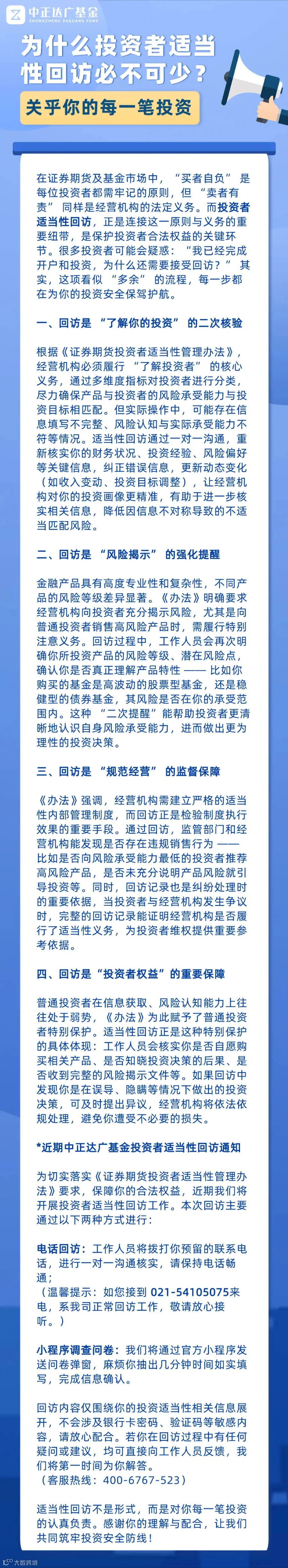若你在回访过程中有任何疑问或建议,均可直接向工作人员反馈,我们将第一时间为你解答。(客服热线:400-6767-523) 适当性回访不是形式,而是对你每一笔投资的认真负责。感谢你的理解与配合,让我们共同筑牢投资安全防线!
