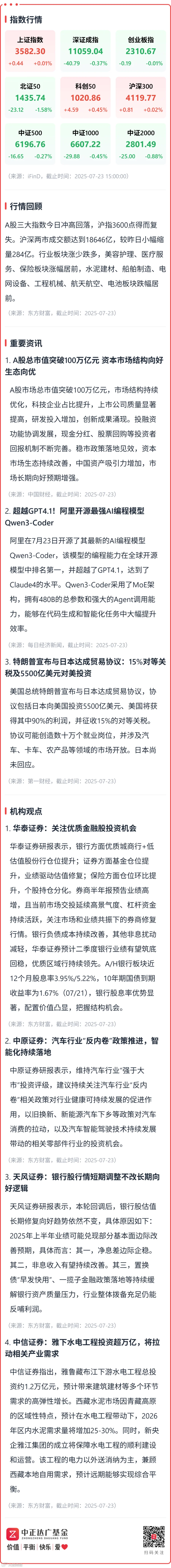 【收盘点评】A股总市值突破100万亿元;特朗普宣布与日本达成贸易协议 中正达广基金