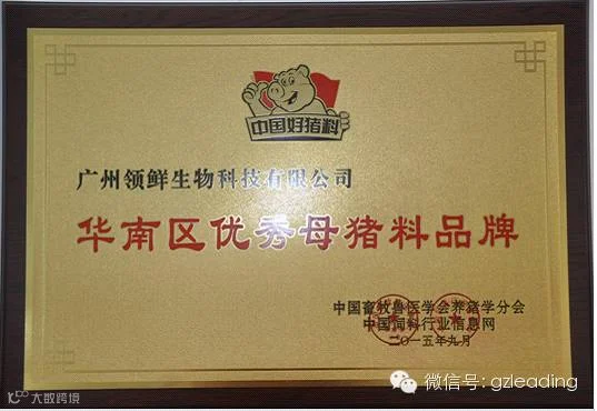 经过一轮激烈的评选,2015年9月18日,在第三届国际母仔猪营养与饲养管理高峰论坛里,广州领鲜生物科技有限公司获得中国畜牧兽医学会养猪学分会与中国饲料行业信息网联合颁发的华南区优秀母猪料品牌称号。领鲜集团成立短短两年时间,这次能获得优秀母猪料品牌称号,显现业内各界对公司给予的关注和支持,也是公司上下齐心协力,迅猛发展的结果。