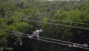 沿输电线路爬行的检查员,危险的工作,给他们点赞!