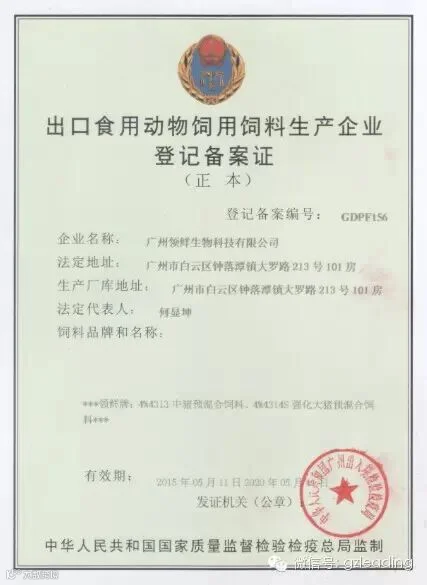 2015年5月11日,广州领鲜生物科技有限公司的预混料产品再获广州出入境检验检疫局颁发《出口食用动物饲用饲料生产企业登记备案证》。自此公司产品将进一步助推、深化公司与出口猪场的合作关系,欢迎更多的外贸猪场踊跃订购领鲜猪料;领鲜领先、让猪价飞得更高!