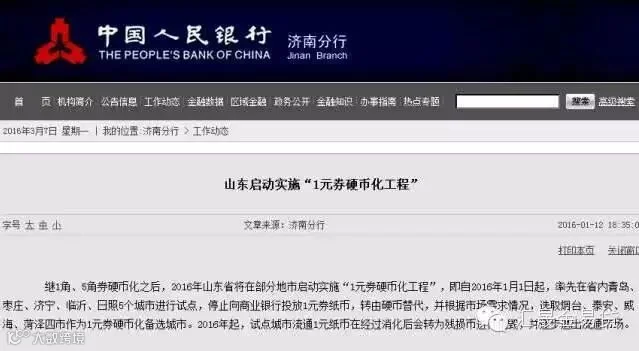 继1角、5角券硬币化之后,1月1日起,山东省在青岛、枣庄、济宁、临沂、日照5个城市进行“1元券硬币化工程”试点,停止向商业银行投放1元券纸币,转由硬币替代。目前该项工作在上述试点城市已经相继启动。1元纸币也会逐步退出流通市场。
