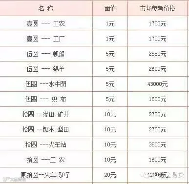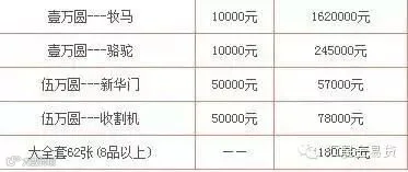 面值1元的卖到1700元。不过更值钱的是面值500元、1千元、1万元、5万元的人民币。面值一万元的牧马,已经卖到162万,面值一万元-骆驼卖到24万。大全套62张的,卖到418万了!