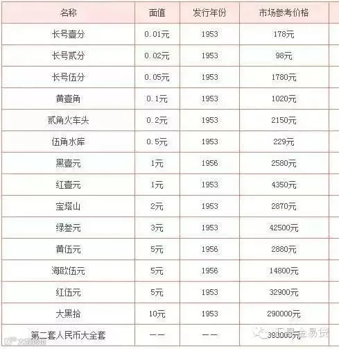 第三套人民币面值最小为1角,最大面值10元。以面值一角的最为值钱,全套价格也不菲,大全套价值6万余元。如下图: