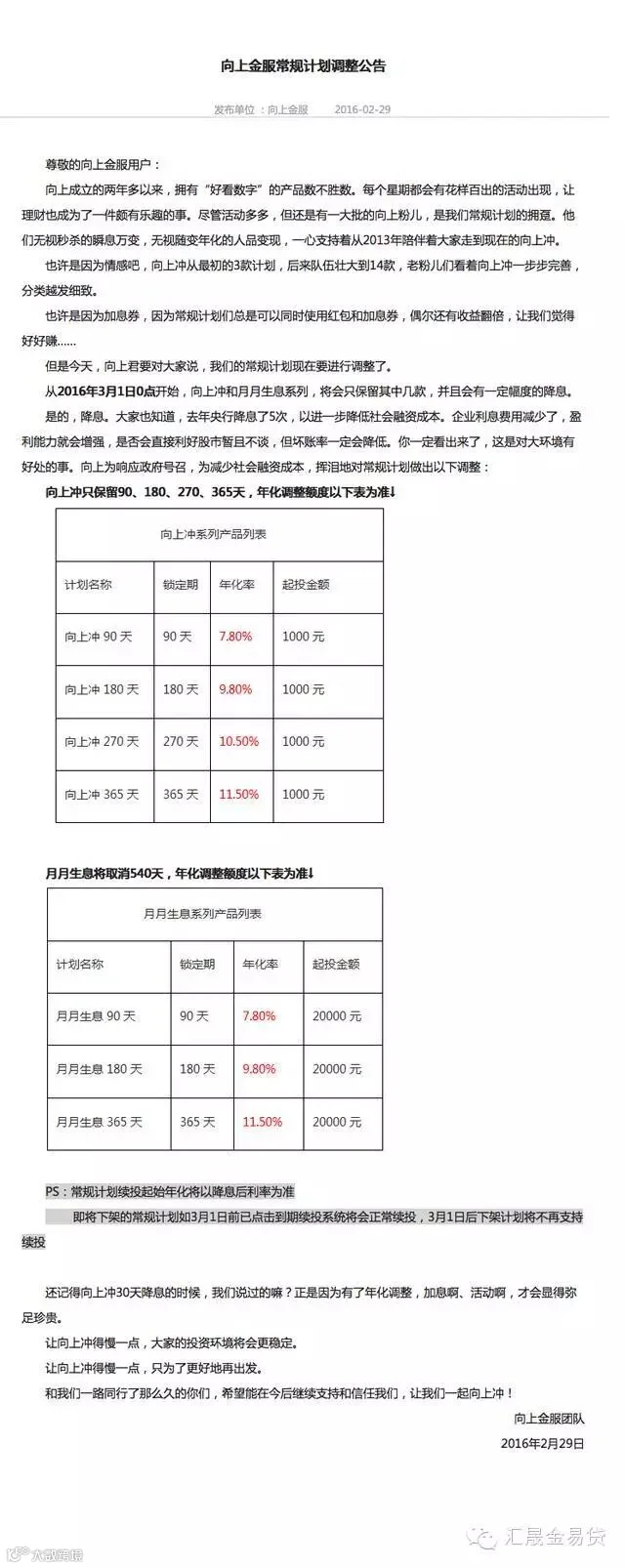 向上金服在其官网发布的公告显示,从3月1日0点开始,向上冲和月月生息系列,将会只保留其中几款,并且会有一定幅度的降息。