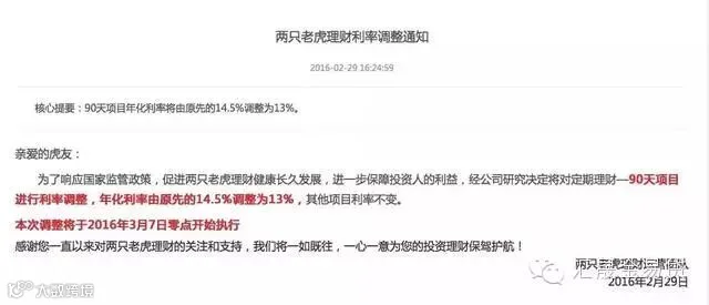 两只老虎发布的公告称:"为了响应国家监管政策,促进两只老虎理财健康长久发展,进一步保障投资人的利益,经公司研究决定将对定期理财——90天项目进行利率调整,年化利率由原先的14.5%调整为13%,其他项目利率不变。"本次调整将于3月7日零点开始执行。