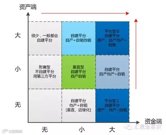 垂直型机构业务类似B2C,机构数量约占20%,有一定的用户和资产规模,但不能构成绝对的规模优。这类机构在金融资产端有着自己的细分领域业务,如房产抵押贷款、车辆抵押贷款,个人信贷等等,然后把这些资产证券化变为理财产品在自有的互联网平台上销售。