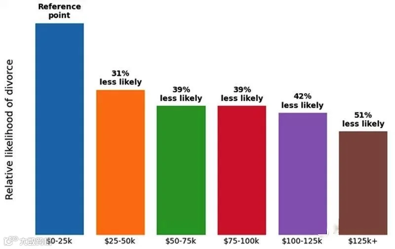 家庭年收入超过12万5000美金的家庭离婚率比其他收入档次的低一半。这结论怎么分析呢?没有物质的爱情可能会散沙没走几步就散了,但物质太充裕的同样有风险,适中最好。