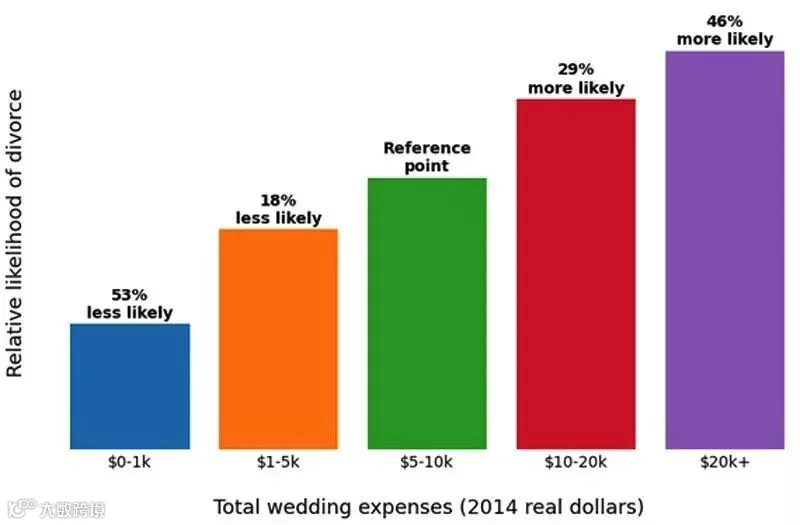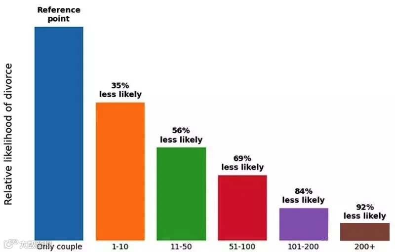 数据明显指出,参加婚礼的人数越多,夫妇离婚的可能性其实越小。那些只有一对新人自己举行的小型婚礼离婚率是最高的,超过200人以上参加的婚礼离婚概率较小。