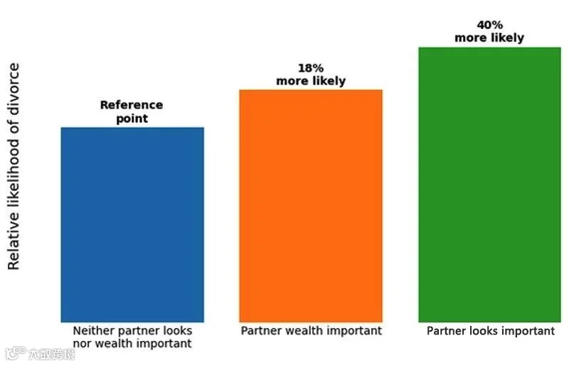 认为妻子长相很重要的男士的离婚率竟比一般男士高出50%,而对于女士来说,认为丈夫很有钱是重要因素的女性,其离婚率也高出60%。这个结论真是人类的阴暗面啊,没办法,人类不能避免会从本性上遵从要脸要钱的基因性问题。