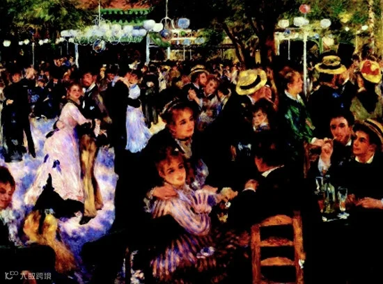 画中背景是位于巴黎马特尔高地的一处很受欢迎的露天歌舞厅。三对跳舞者组合成了一个正边三角形的构图,看上去均衡、对称。一场普通的舞会,在画家的笔下变得特别雅致有趣,甚至让人有一种到了缥缈仙境的感觉,集中体现了那个时代自由、闲适的时代精神。