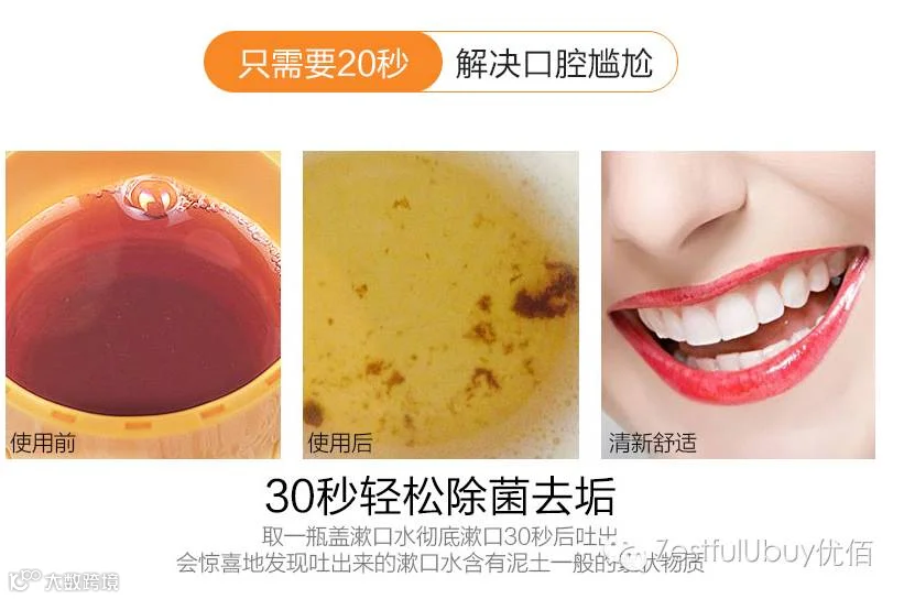 看到没!右边的污渍就是牙垢哦……不要以为不抽烟不喝茶什么的就不会有牙垢,可能外面看不出来,但它实实在在的存在哦!平时我们吃饭也会有食物残渣,仅仅靠刷牙的清洁力是远远不够的,但是漱口水可以清洁口腔。连牙刷也难刷到的地方也可以清洁!还可以去除口气和异味,清理口腔垃圾,轻轻松松告别食物残余,口氣,牙石,烟渍等!