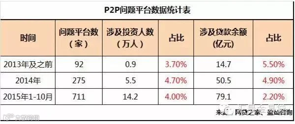 此外,数据显示,截至10月底,2015年问题平台涉及的投资人数约为14.2万人,涉及贷款余额为79.1亿元,占比为2.2%。而2014年全年,问题平台涉及的投资人数约5.5万人,涉及贷款余额约为50.5亿元,占比为4.9%。