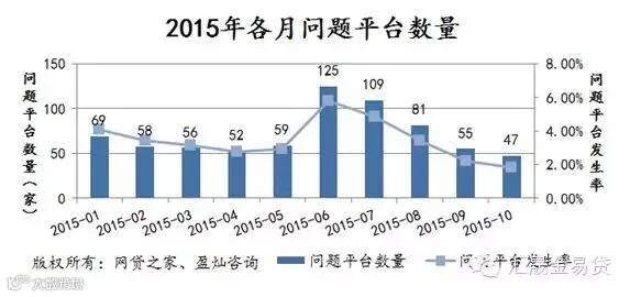 网贷之家最新数据显示,今年10月新增问题平台47家。截至2015年10月底,累计问题平台达到1078家,P2P网贷行业累计平台数量达到3598家(含问题平台)。