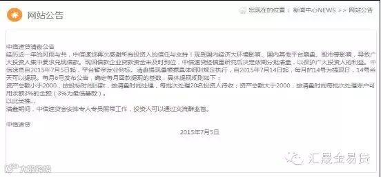另一家平台中信速贷则发布清盘公告称:自2015年7月14日起,每月的14号为提现日,14号当天可以提现。资产总额小于2000元,按投标时间回款,按清盘时间处理,每批次处理20名投资人待收;资产总额大于2000元,按清盘时间每批次处理账户可用余额3%的金额。这就意味着,那些资产总额小于2000元的普通小散,每个月只有一次机会可以取出资产,前提是有幸挤进前20名。