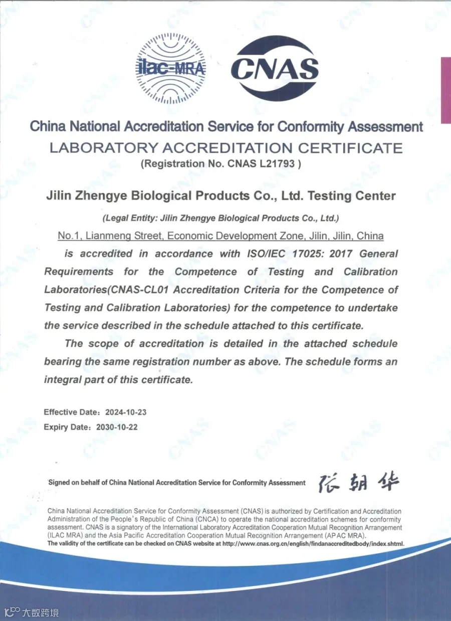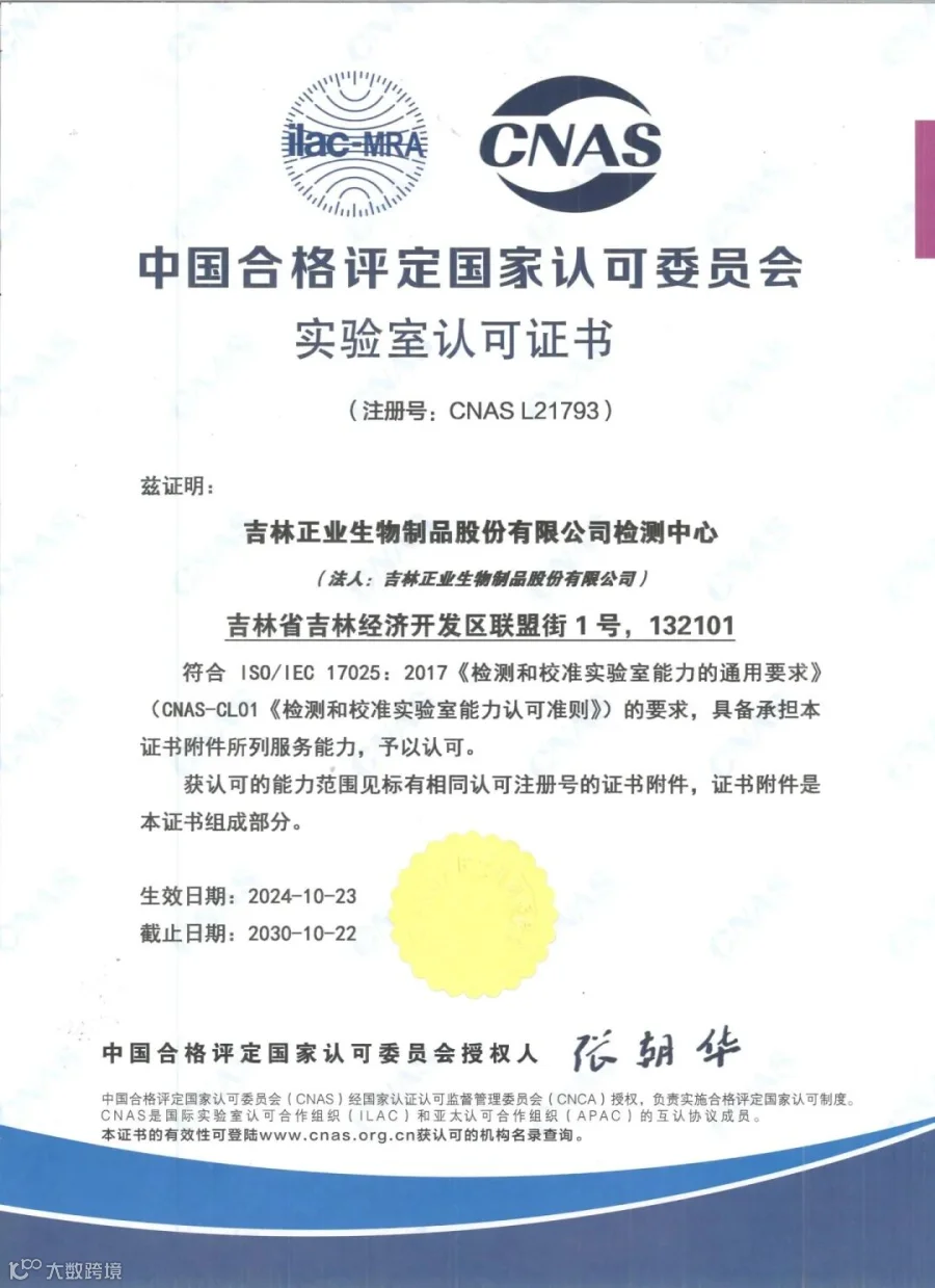 2024年10月31日,吉林正业生物制品股份有限公司检测中心(以下简称“检测中心”)收到中国合格评定国家认可委员会(CNAS)颁发的《中国合格评定国家认可委员会实验室认可证书》。这标志着检测中心的管理水平、检测质量与技术能力再上一个台阶。