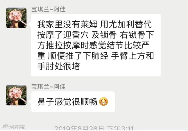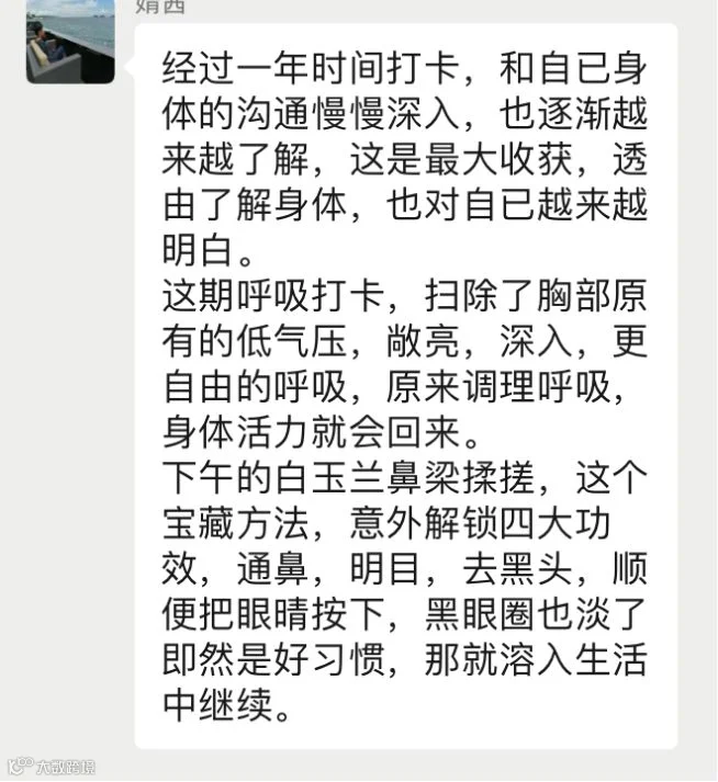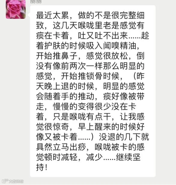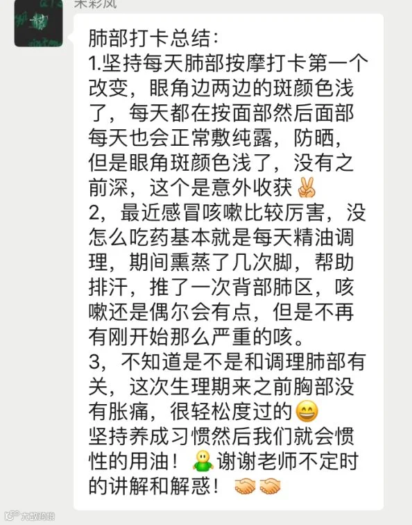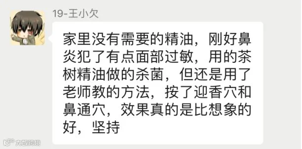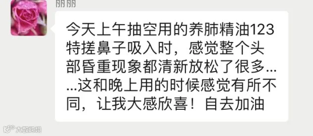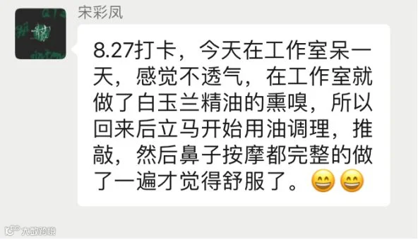前段时间,我们进行了一次“秋季养肺”的打卡活动。一边闻着白玉兰清幽的香气,一边吸收着精油分子天然的灵气,大家都表示不仅皮肤状况改善了,身体较以往也好了不少!过程中还带动了家人一起走进精油的奇妙世界,彼此间的感情更加亲密了~