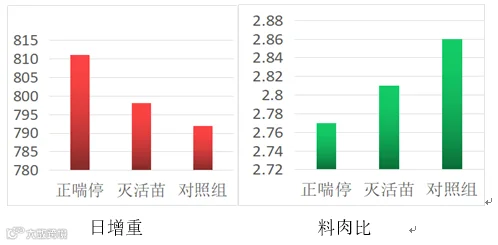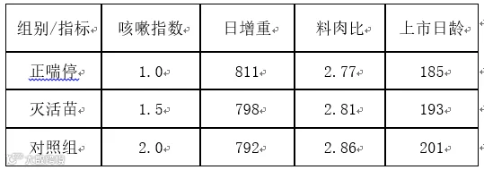 通过结果可以看出,使用正喘停组,日增重比使用灭活苗组多13g,比对照组多19g;料肉比比灭活苗组低0.04,比对照度低0.09;上市日龄比灭活苗毒提前8天,比对照组提前16天。