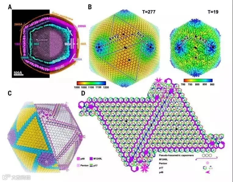 在我们的模型中,骨架蛋白M1249L作为构建衣壳骨架的骨架,决定衣壳的大小。与此同时,在PRD-1、pbcv -1和Bam35中也发现了具有类似功能的纤维样蛋白,提示了类似的组装途径。