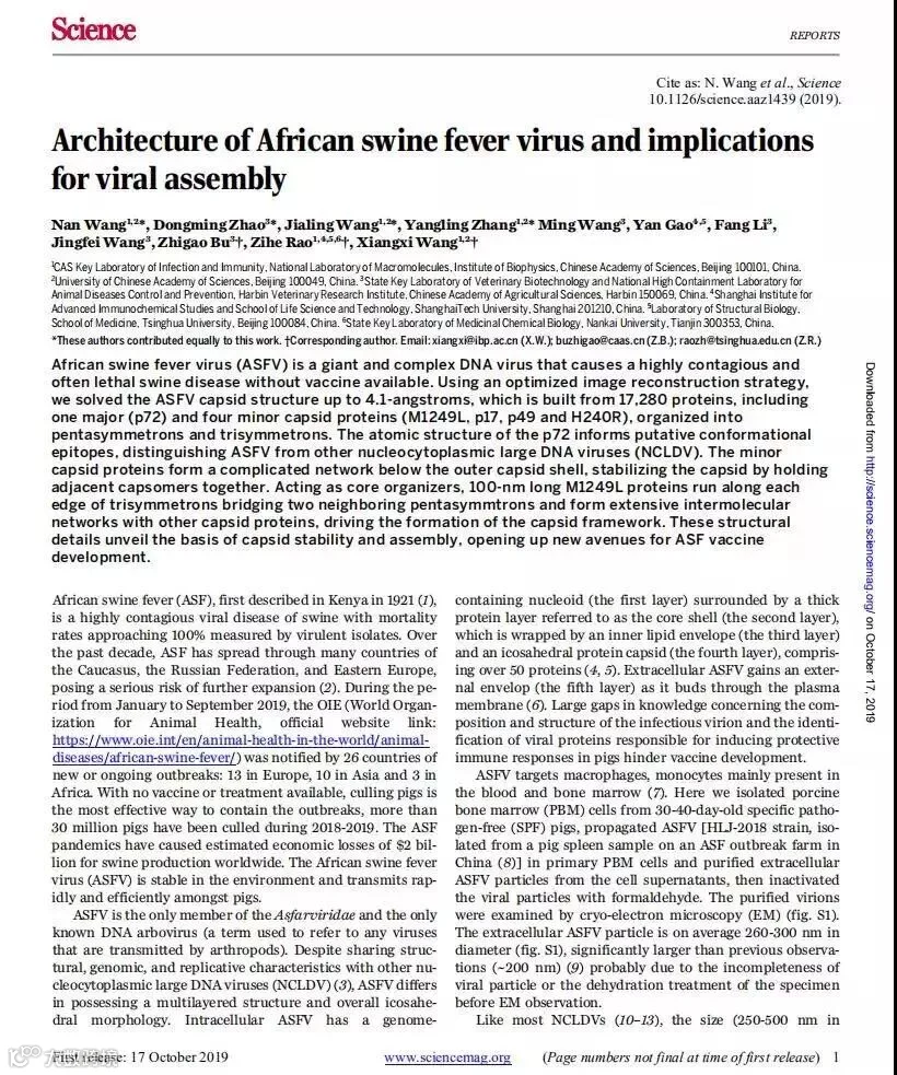 中国科学院生物物理研究所饶子和/王祥喜团队和中国农业科学院哈尔滨兽医研究所步志高团队合作在Science上发表了题为Architecture of African Swine Fever Virus and implications for viral assembly(非洲猪瘟病毒结构及装配机制)的文章。