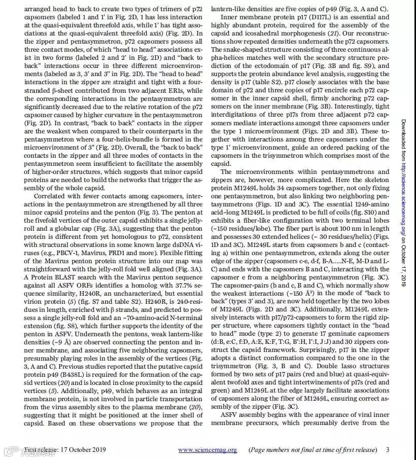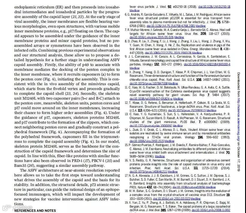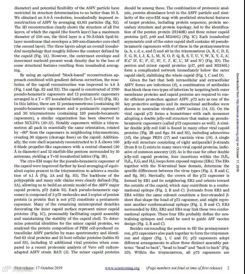 本文报道的ASFV架构具有接近原子的分辨率,这使我们能够迈出第一步,了解ASFV衣壳组装驱动因素以及其稳定性的基础。此外,其结构细节,尤其是p72原子结构,可以指导抗原决定簇的免疫原的合理设计,为安全高效的新型非洲猪瘟疫苗研究奠定了基础。