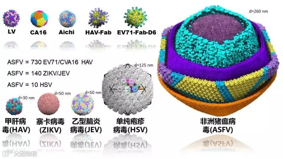 图2:非洲猪瘟全病毒与多种动物病毒对比三维结构图