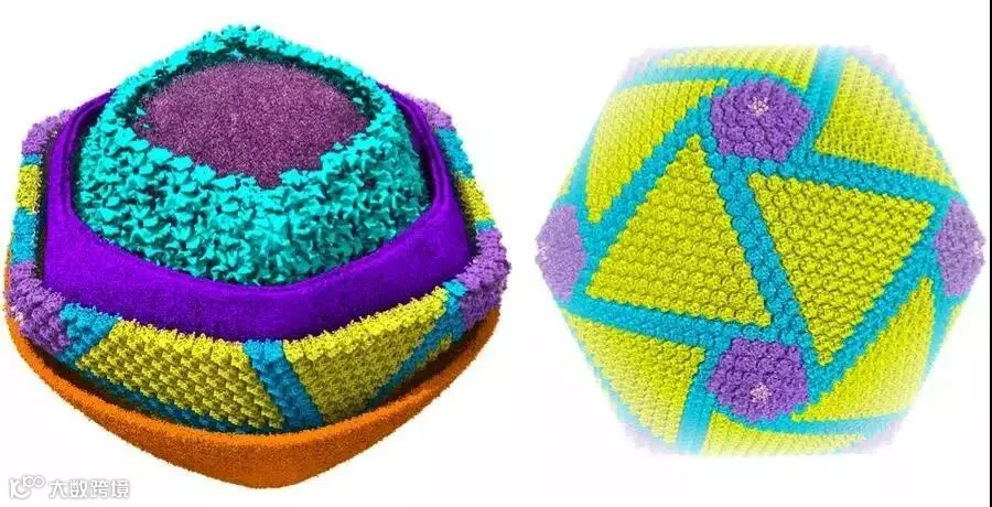 非洲猪瘟病毒整体结构(左:5层切面图;右:衣壳层整体结构)