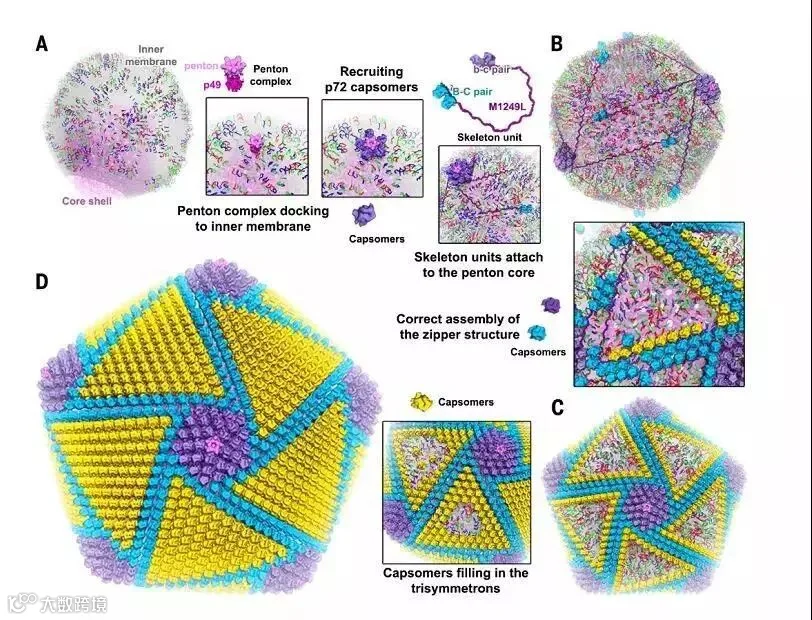 其次,骨架单元M1249L有两个capsomer对(b-c和b-c)附着在penton core上,同时骨架单元、penton core和p17可以在内膜上移动,增加了它们形成高阶组装的机会(图4)。在p17的引导下,capsomers、骨架蛋白M1249L和p17参与zipper的形成,将相邻的penton core连接起来,逐渐形成一个多面体骨架(图4)。伴随着多面体骨架的形成,capsomers分子填充三对称体以完成衣壳组装(图4)。