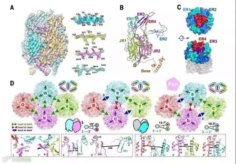 p72 capsomers除了围绕着penton来填充pentasymmetron外,还会打包形成trisymmetron和zipper(图1,C和D)。p72 capsomers采用不同的排列方式,允许三种不同的装配模式:头对背、头对头和背对背(图2D)。在三对称性中,所有P72 capsomers都是头对背排列,形成两种类型的P72 capsomers三聚体(图2D中分别标记为1和1’,其中1在拟等价三重轴上的相互作用较小,而1’在拟等价三重轴上的关联较紧密)(图2D)。在zippers和pentasymmetron中,p72 capsomer拥有所有三种接触模式,其中头对头关联以两种形式存(图2D标注为2、2’),背对背交互发生在三种不同的微环境中(图2D标注为3、3’、3’’)。zipper中的头-头相互作用直接紧密,由两个相邻的ER1形成的四股β-片形成,而由于p72 capsomer的相对旋转是由较高的曲率引起的,因此在pentasymmetron中相应的相互作用明显减少(图2D)。相比之下,与形成四螺旋的pentasymmetron相比,zipper中的背对背接触是最弱的(图2D)。总的来说,zipper中的背对背接触和所有三种模式的接触在pentasymmetron中似乎不足以促进高阶结构的组装,这表明需要少量的次要衣壳蛋白来构建触发整个衣壳组装。