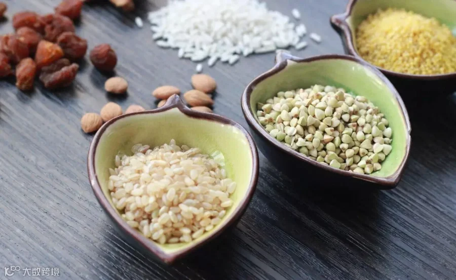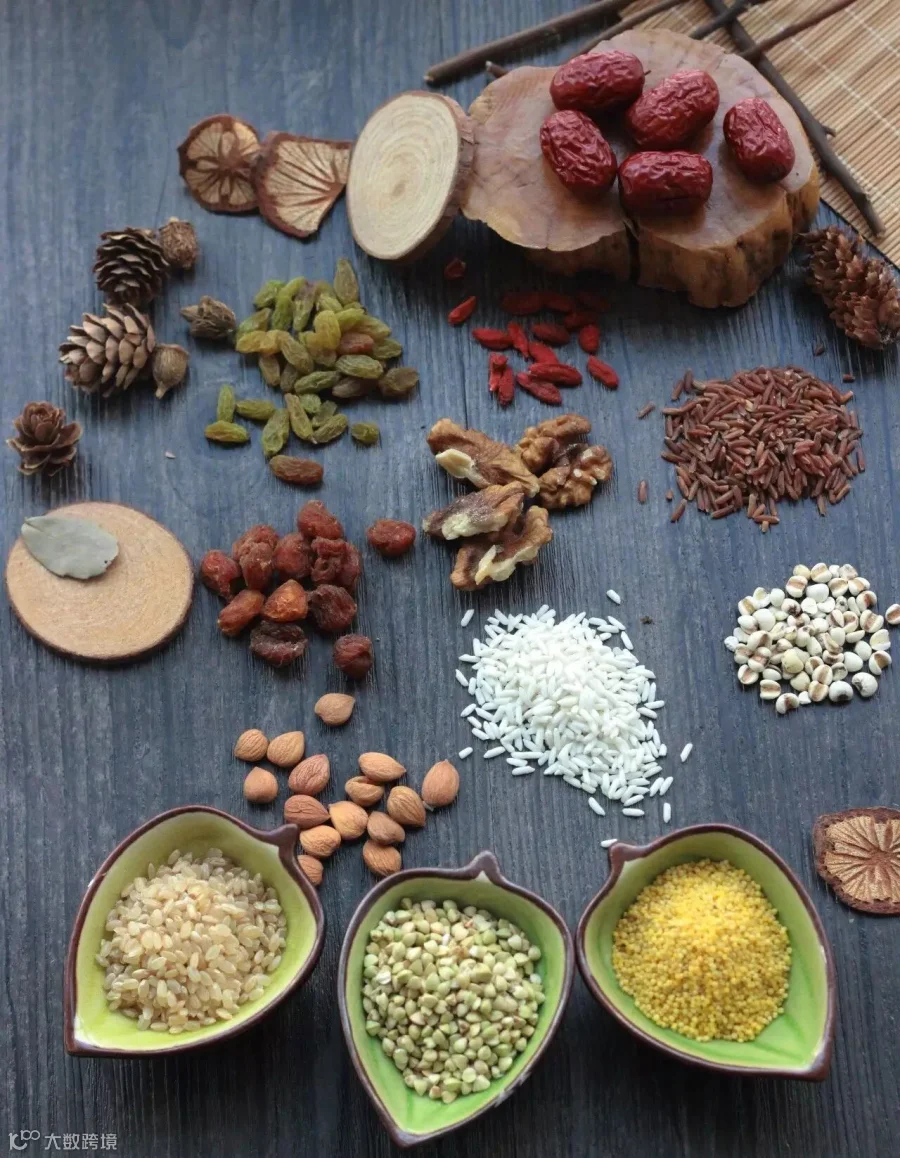 腊八粥的主要原料为谷类,有粳米、糯米和薏米。粳米含蛋白质、脂肪、碳水化合物、钙、磷、铁等成分,具有补中益气、养脾胃、和五脏、除烦止渴、益精等功用。糯米具有温脾益气的作用,适于脾胃功能低下者食用,对于虚寒泄利、虚烦口渴、小便不利等有一定辅助治疗作用。中医认为薏米具有健脾、补肺、清热、渗湿的功能,经常食用对慢性肠炎、消化不良等症也有良效。富含膳食纤维的薏米有预防高血脂、高血压、中风及心血管疾病的功效。