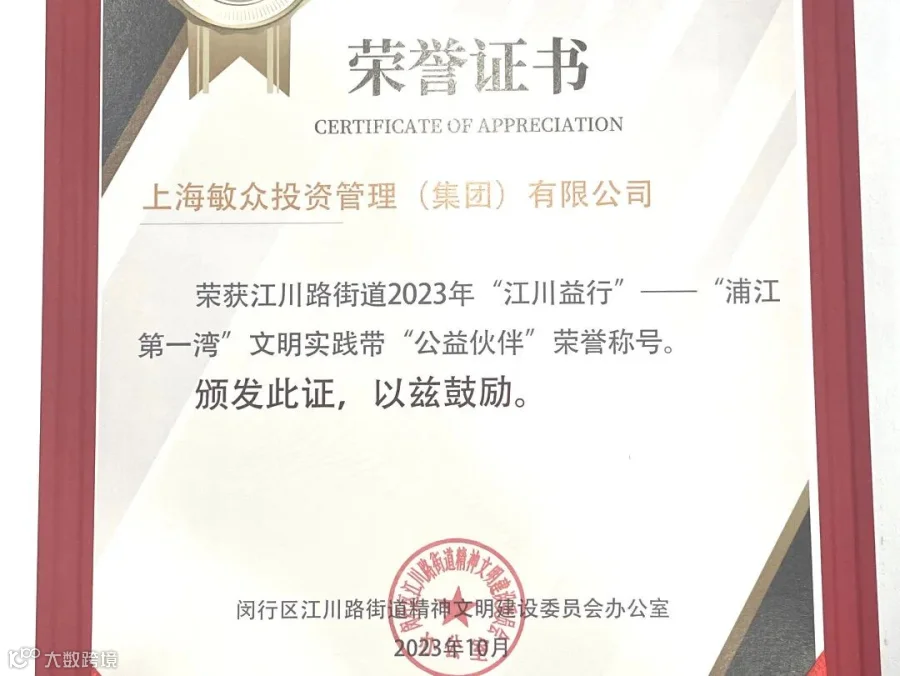 敏众集团荣获江川路街道2023年“江川益行”——“浦江第一湾”文明实践带“公益伙伴”荣誉称号。