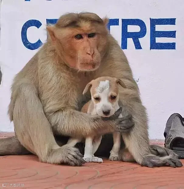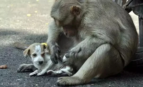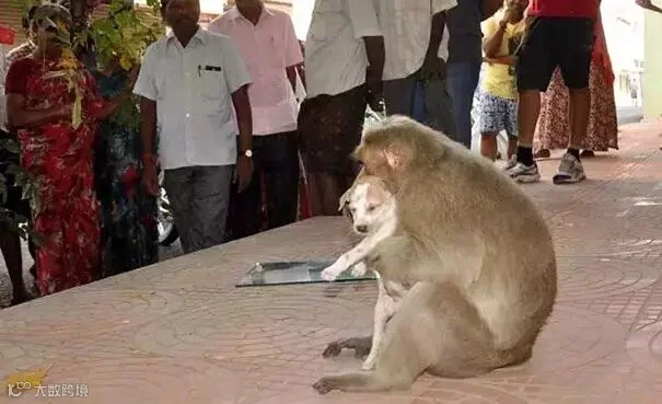 可以看得出来猴子已经完全把这只小流浪狗当成自己的孩子了 大自然任何时候都是残酷的。猴子自己本身要觅食已经很困难,更何况还要带着一只小狗。。 周围的人开始只是用看新鲜事的心情看着这一切,直到有天它们俩遭遇了危险——其他的流浪狗出现了,想伤害猴子怀里的小狗。这时候,猴子像发疯一样冲上去就撕那些狗,把他们吓跑了。