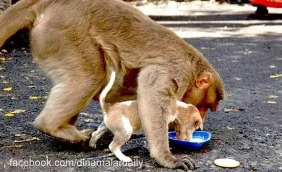 印度的城市Erode的繁忙街道上,每天人来人往,很少人会停下脚步,也很少有话题会持续热门。 然而最近这里的人们却一直在讨论着一只猴子的事迹,甚至当地的媒体都报道了这只猴子。。 当地一只猴子不知道什么情况下,收养了街边的一只小流浪狗,从此这对奇怪的组合就一直陪伴着对方。。