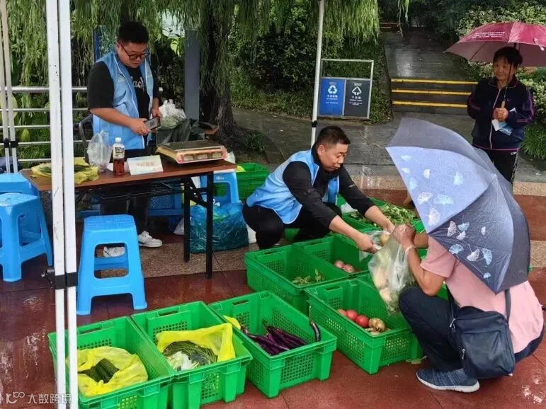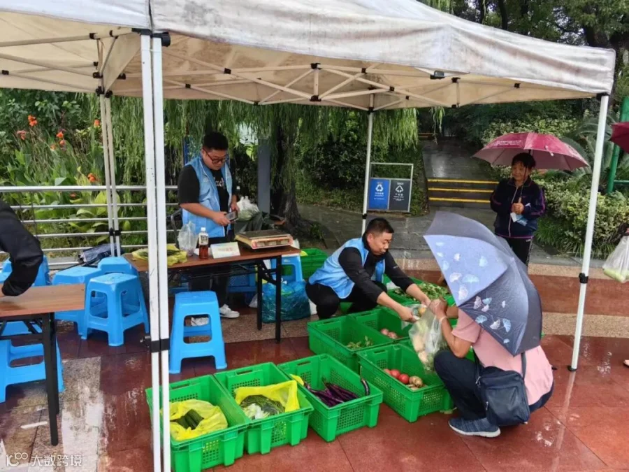 在敏众集团的平价蔬菜摊位前,居民们仔细地挑选着便宜、实惠的蔬菜;孟铁飞、杨壹明、曹锦德也体验了一把当摊主的经历,选菜、装袋、称重、收银,一通操作下来忙而有序。