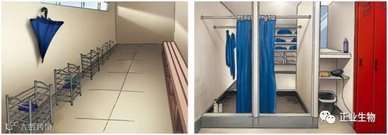 淋浴间是猪场生物安全必备的基础设施,有条件的猪场可以每个独立的生产区设立独立的淋浴间。淋浴间的要求有明确的脏区(靠近场外一侧,主要用于存放个人衣服鞋子和物品的区域)和净区(靠近场内一侧,存放厂区内工作服和鞋子)的划分,内外的衣服鞋子严格区分,最好有颜色的不同。淋浴间要设置舒适的环境,让员工不抵触淋浴。要求员工进出都要淋浴,每次淋浴时间不得低于5分钟。