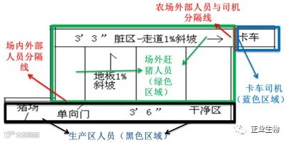 虽然对各个不同区域或部门进行分级,但同时我们还要重点抓住几个关键的地方,比如卖猪的出猪台、死猪处理区、饲料仓库(中转)以及粪便储存处等;因为这些关键地方是经常性地直接与外部接触的,所以这些地方也是我们猪场设计与布局的重中之重。在这些地方,我们要杜绝场内的工作人员进入这些区域,应由专人负责这些区域的日常工作。