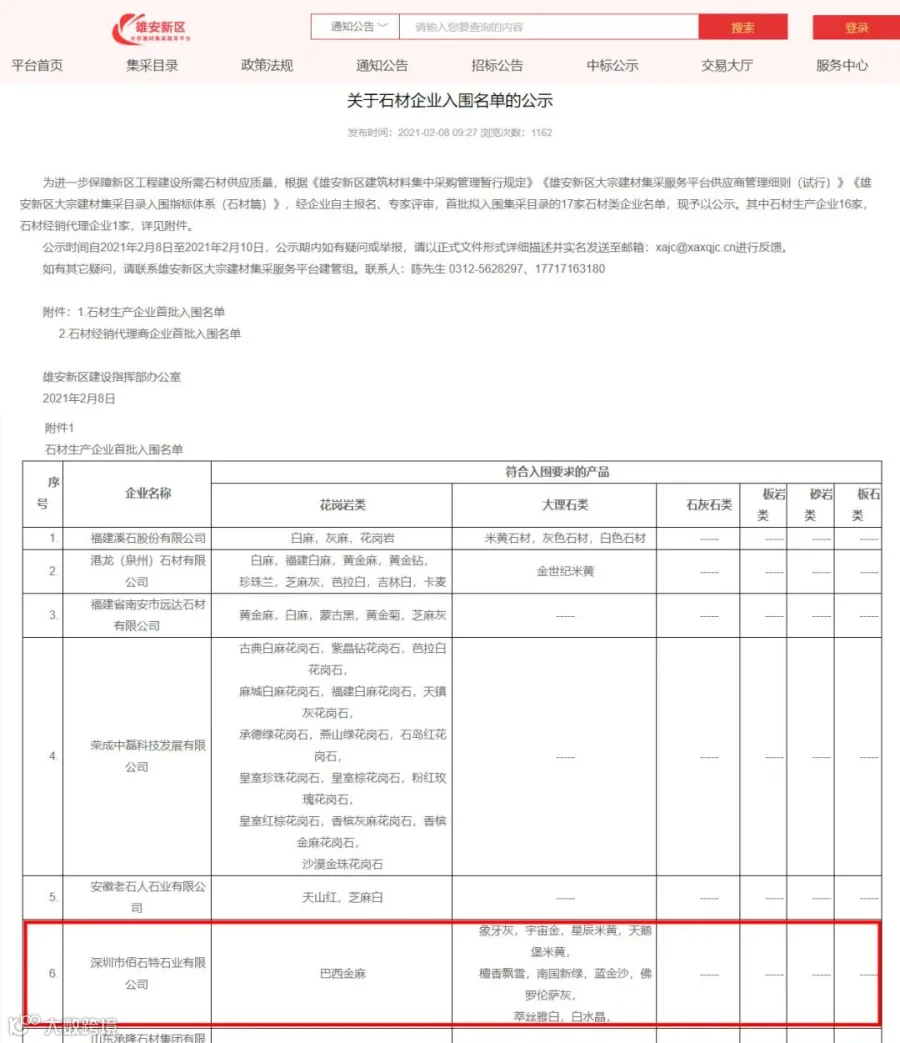 为保障雄安新区建设工程项目石材供应有序、质量可靠、价格优惠,为创造“雄安质量”及建设“廉洁雄安”提供有力的基础,2020年底雄安新区建设指挥部办公室发布石材供应商集采征集通知,申报企业近200家,佰石特石业积极响应,按要求提交石材企业集采信息、申报入围资料。