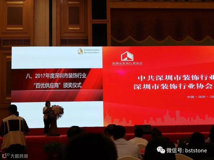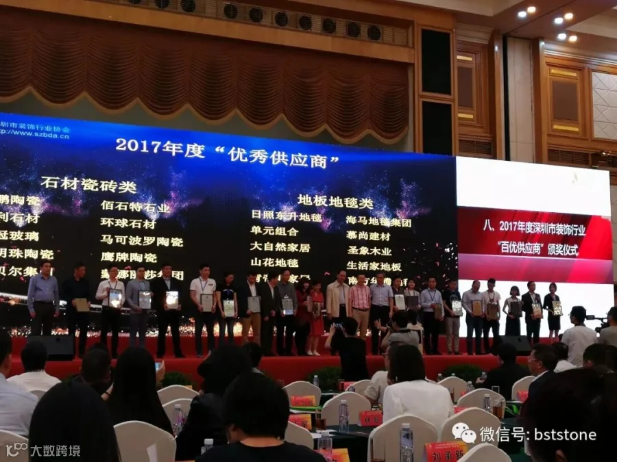 对于供应商来说,大会最重要的一个环节无过于颁奖环节了,此次石材瓷砖类入围十大优秀供应商的有十六家企业,最终获奖的只有十家,佰石特也得此殊荣,这项殊荣对于我司来说起到了一个激励的作用,我司定会继续前行,紧随社会、行业发展脚步,为深圳装饰行业做出贡献!