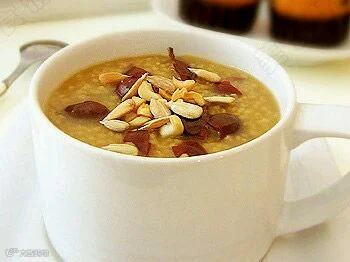 原料:小米150克、小枣10颗、花生仁、瓜子仁、红糖10克