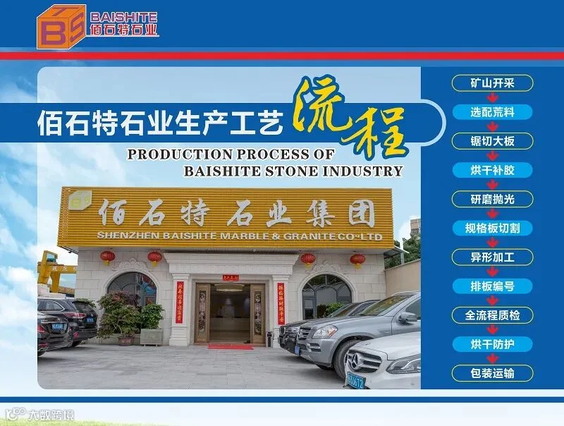 “工欲善其事,必先利其器”,集团为满足市场需求,在深圳南山区及宝安区投资建设了大型加工中心,在福建省水头镇投资建设了大板批发中心和配套加工基地,分设拉锯、补胶、磨抛、介板、板材打磨、工艺、工艺打磨等车间,拥有世界先进的石材加工设备100多台/套,如皮带全自动五轴桥切机、加工中心机等,形成年产荒料20万平方米,工程板60万平方米,弧板1万平方米,及各类线条10万米的加工规模。