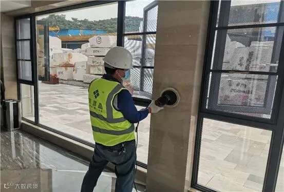 为降低石材破损程度,在石材背后粘贴玻璃纤维增强网。