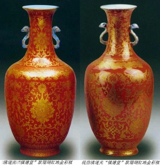 此外,古瓷上金彩的颜色也不一样,清代道光十年(1 840年)以前瓷器上的金色一般是用金粉描绘,金色深沉,稳重。1840年以后仿制的古瓷是用金水描画,虽光泽度好,但不如以前的色深。