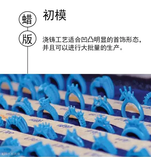 失蜡浇铸加工工艺的流程为:制作金属模型——压制胶模——注蜡模——植蜡树——灌制石膏模——铸件浇铸。
