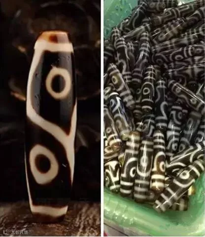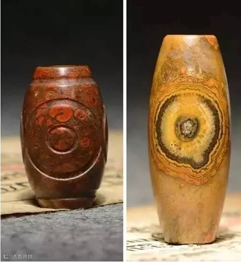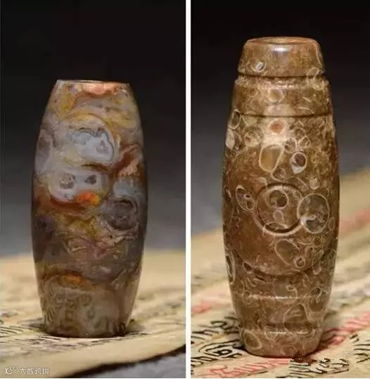 左是古代工艺的古董天珠,右是现代工艺饰品天珠