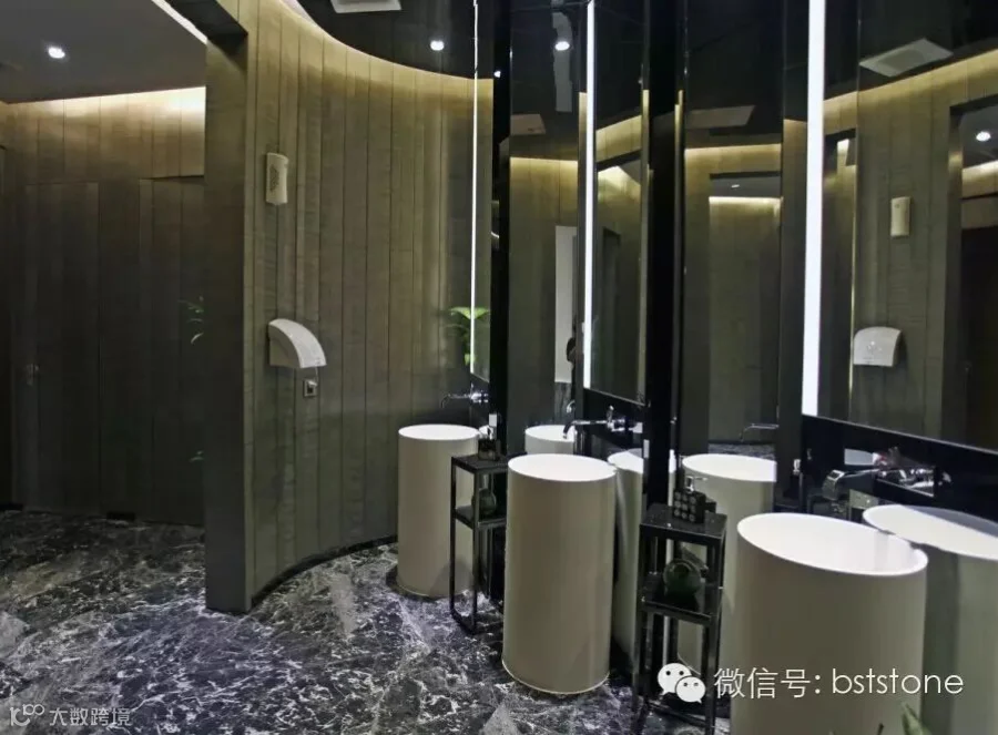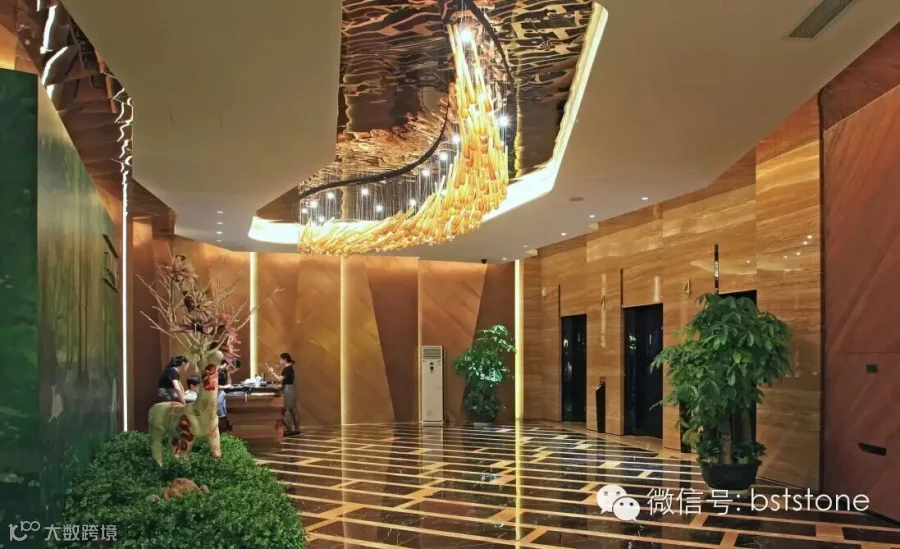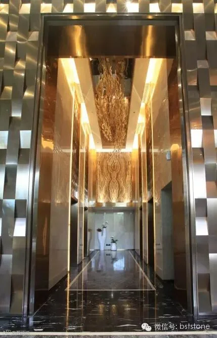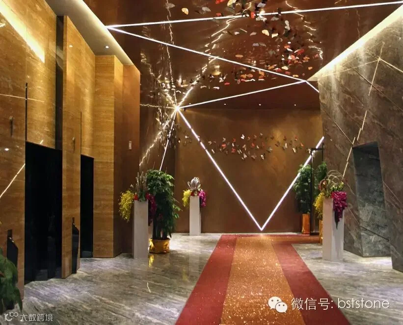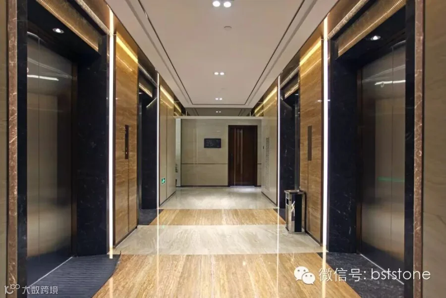 入户大堂选用我司优质产品,墙面选用诺娃米黄、琥珀玉石与黄金洞石等。地面选用马德里灰、波斯海浪灰等石材。在设计大师的搭配运用下,强烈的视觉冲击感,让人眼前一亮。